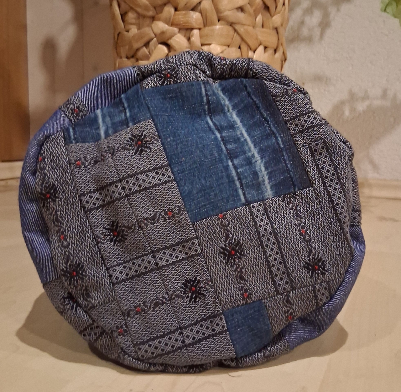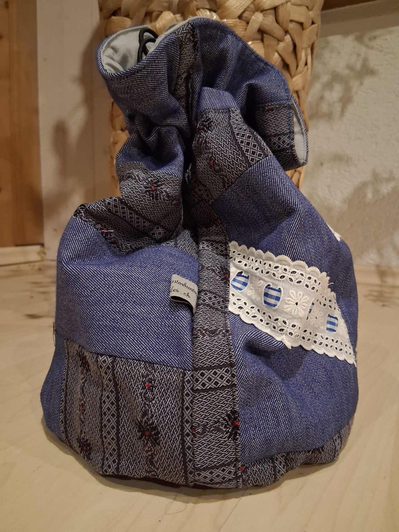 Der Kartoffelsack wurde aus schwarzen Edelweiss-Stoffe und Jeans Stoff genäht. Mal ganz anderes.Bodendurchmesser ca.17 cm, Höhe ca.28 cm.