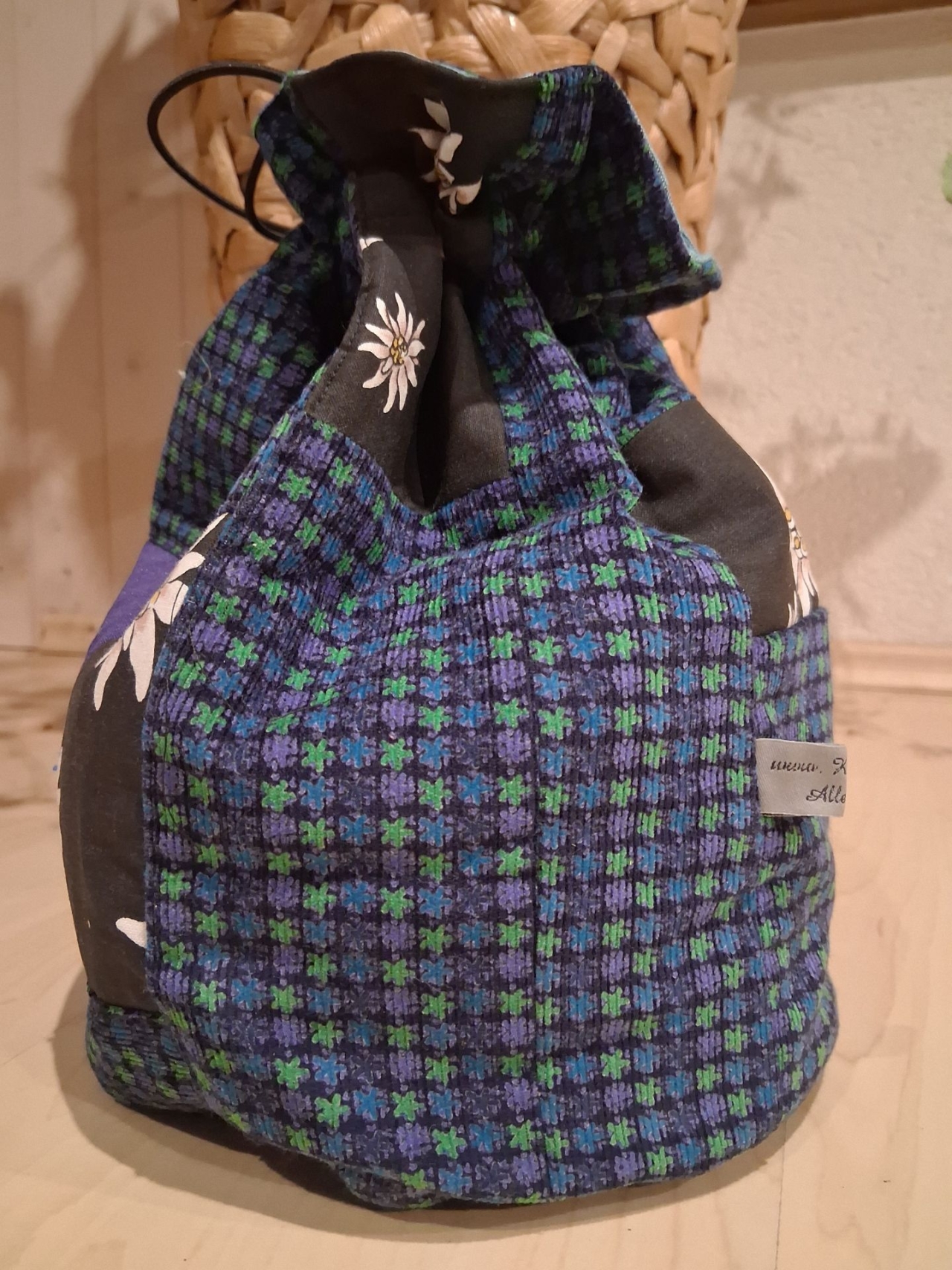 Kartoffelsack aus Nickiplüsch blau/lila/mint.Dazu habe ich schwaren Baumwollstoff mit grossen Edelweiss kombiniertden. Fröhliche Farben mal ganz anders.