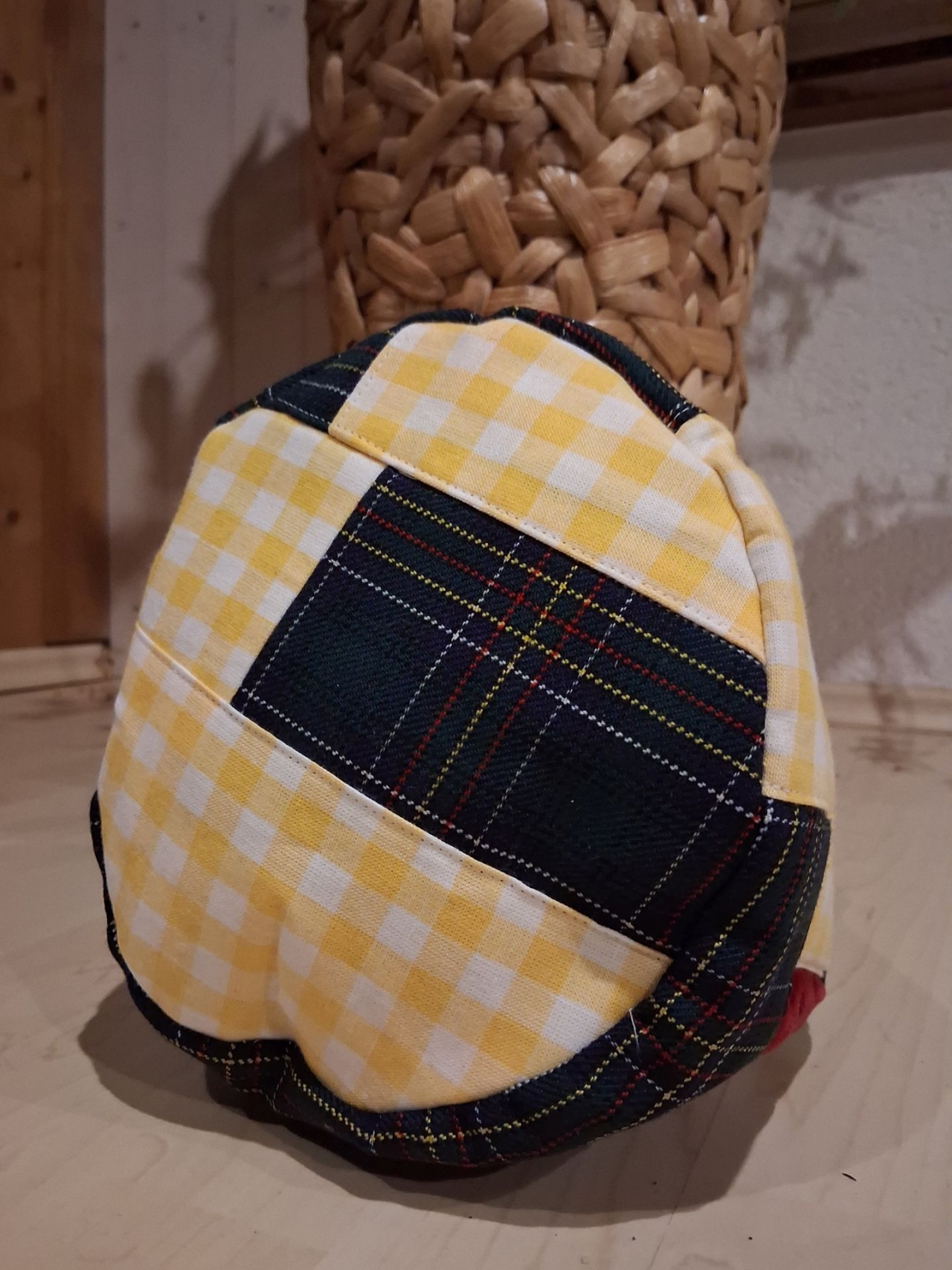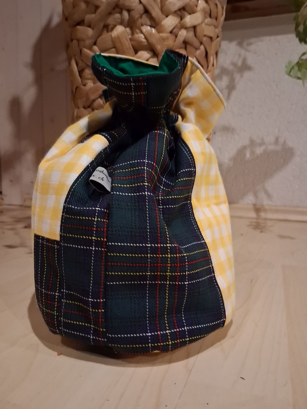 Kartoffelsack aus grünem karo mit Berg und Kreuz auf rotem Nickiplüsch, farblich ein toller Hingucker der Ihre Kartoffen schön warm hält.